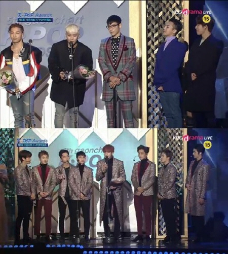 ▲인위에타이 아시아 최고영향력상 : 빅뱅그룹 빅뱅과 엑소가 '2016 가온차트 K-POP 어워드'에서 나란히 5관왕에 올랐다. <사진출처=KBS드라마 생방송 캡처>