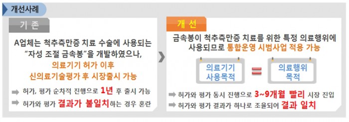 하지만 의료기기 허가와 신의료기술평가 통합운영 시범사업 실시에 따라 시장 진입까지 소요되는 기간이 기존보다 3~9개월 단축된다. 다만, 일부 시술 등 검토기간의 연장이 필요한 경우 최장 280일이 소요될 예정이다.