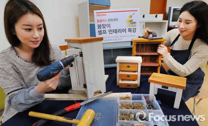 이원경 홈플러스 문화센터 팀장은 “셀프족을 위한 강좌들은 강의 시간에 직접 체험하고 실생활에 쉽게 적용할 수 있는 프로그램으로 구성했다”며 “앞으로도 소비자 니즈를 파악하는 한편, 트렌드를 반영한 다양한 강좌를 확대해 갈 계획이다”라고 말했다.21일 홈플러스 영등포점 문화센터에서 모델들이 직접 가구 리폼 작업을 해보고 있다. 홈플러스 문화센터는 봄맞이 인테리어, 도시락 만들기, 부동산 경매 등 셀프족을 위한 다양한 강좌를 연다.<사진제공=홈플러스>