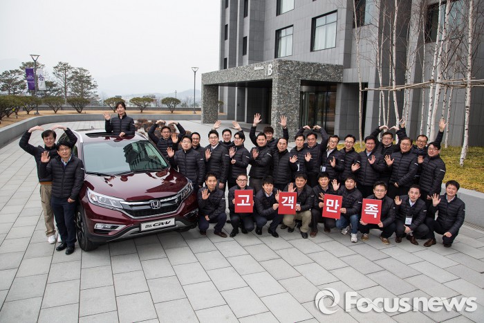 혼다코리아는 국내 시장조사 전문기관인 컨슈머인사이트가 최근 발표한 '2015 자동차 연례 기획조사'에서 국산차와 수입차를 통틀어 AS 만족도 부문 3년 연속 1위로 선정된 바 있다.CS 워크숍 참가자들이 단체 사진을 찍고 있다. <사진제공=혼다코리아>