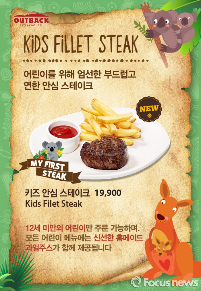 (서울=포커스뉴스) 아웃백 스테이크하우스(이하 아웃백)은 어린이 입맛과 영양을 고려한 '마이 퍼스트 스테이크' 메뉴로 어린이 메뉴 강화에 나섰다.