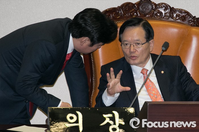 (서울=포커스뉴스) 23일 오후 서울 여의도 국회 본회의장에서 테러방지법과 관련해, 김광진 더불어민주당 의원이 무제한 반대토론하는 동안, 정의화(오른쪽) 의장과 원유철 새누리당 원내대표가 논의하고 있다.