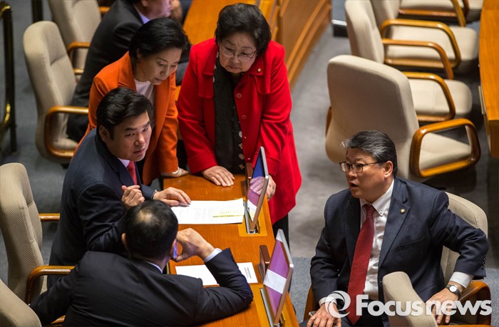 (서울=포커스뉴스) 23일 오후 국회 본회의장에서 김광진 더불어민주당 의원이테러방지법 본회의 의결을 막기 위해 무제한토론을 시작하자 원유철 새누리당 원내대표 등 새누리당 의원들이 대화를 나누고 있다.