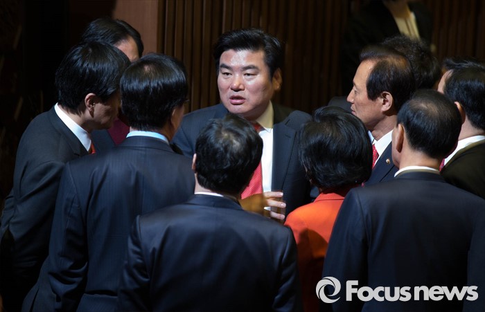 (서울=포커스뉴스) 23일 오후 국회 본회의장에서 김광진 더불어민주당 의원이테러방지법 본회의 의결을 막기 위해 무제한토론을 시작하자 원유철(가운데) 새누리당 원내대표 등 새누리당 의원들이 대화를 나누고 있다.