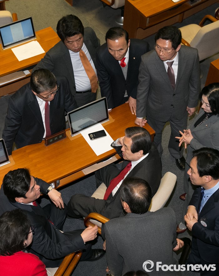 (서울=포커스뉴스) 김무성(두번째줄 가운데) 새누리당 대표와 원유철(두번째줄 왼쪽) 원내대표를 비롯한 여당 의원들이 23일 오후 서울 여의도 국회 본회의장에서 테러방지법과 관련해, 김광진 더불어민주당 의원이 무제한 반대토론하는 동안, 논의하고 있다.