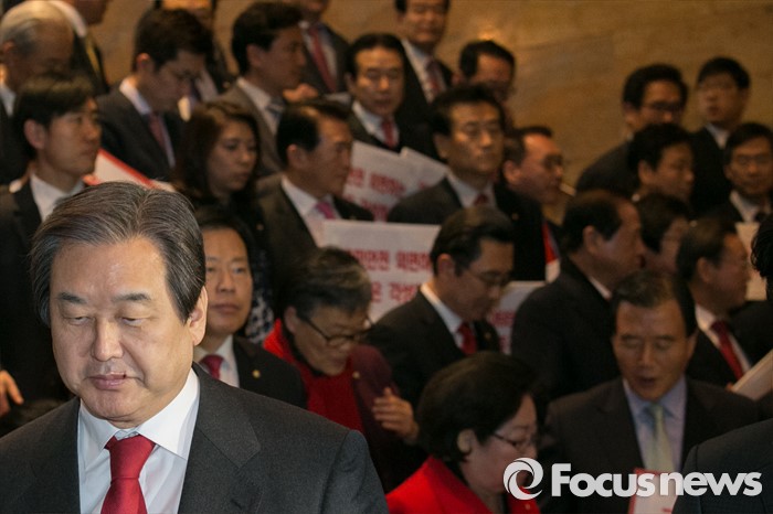 (서울=포커스뉴스) 김무성 새누리당 대표가 23일 오후 서울 여의도 국회 로텐더홀에서 테러방지법과 관련한 야당의 필리버스터에 대해, 규탄성명을 발표한 뒤 자리를 나서고 있다.