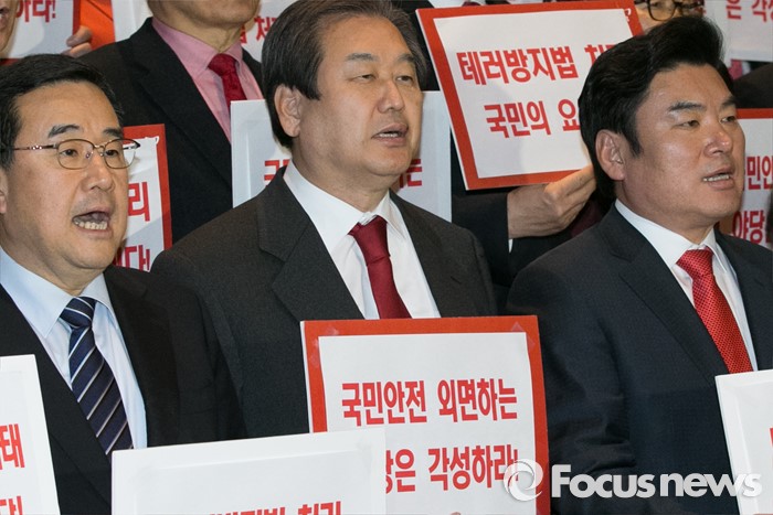(서울=포커스뉴스) 김무성(가운데) 새누리당 대표와 원유철(오른쪽) 원내대표를 비롯한 의원들이 23일 오후 서울 여의도 국회 로텐더홀에서 테러방지법과 관련한 야당의 필리버스터에 대해, 규탄성명을 발표하고 있다.