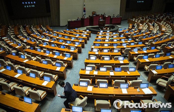 (서울=포커스뉴스) 23일 오후 국회 본회의장에서 김광진 더불어민주당 의원이 테러방지법 본회의 의결을 막기 위해 무제한토론을 시작한 가운데 윤영석 새누리당 의원이 본회의장을 떠나고 있다.