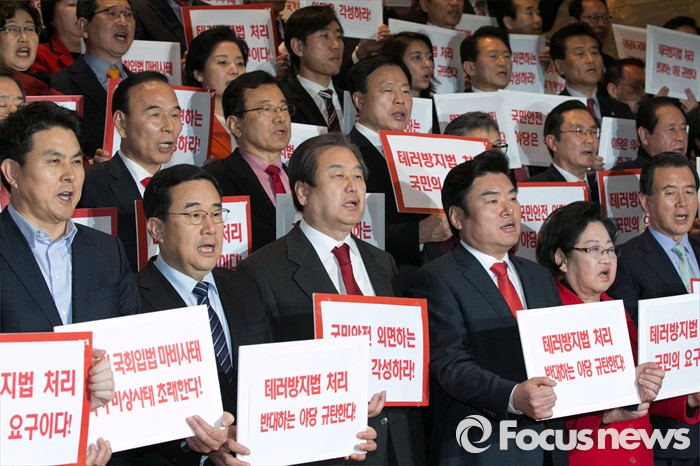 (서울=포커스뉴스) 김무성(앞줄 왼쪽 세번째) 새누리당 대표와 원유철(앞줄 오른쪽 세번째) 원내대표를 비롯한 의원들이 23일 오후 서울 여의도 국회 로텐더홀에서 테러방지법과 관련한 야당의 필리버스터에 대해, 규탄성명을 발표하고 있다.