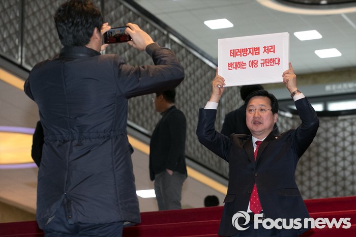 (서울=포커스뉴스) 이장우(오른쪽) 새누리당 의원이 23일 오후 서울 여의도 국회 로텐더홀에서 테러방지법과 관련한 야당의 필리버스터에 대해, 규탄성명을 발표한 뒤 기념사진을 찍고 있다.