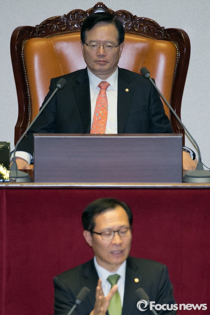 (서울=포커스뉴스) 정의화(위) 의장이 24일 오전 서울 여의도 국회 본회의장에서 문병호 국민의당 의원의 테러방지법과 관련한 무제한 토론을 경청하고 있다.