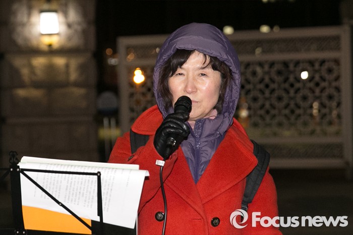 (서울=포커스뉴스) 한 시민이 24일 오전 서울 여의도 국회 정문 앞에서 테러방지법 처리를 반대하는 시민 필리버스터에 참여해 연설을 하고 있다.