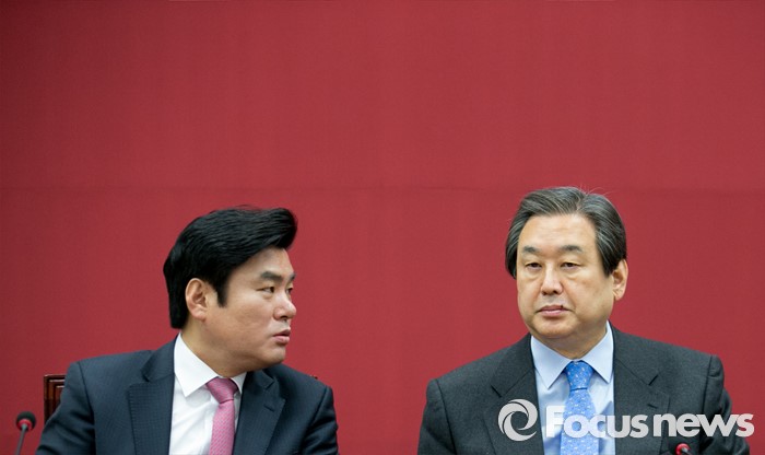 (서울=포커스뉴스) 김무성(오른쪽) 새누리당 대표가 24일 오전 서울 여의도 국회에서 열린 최고중진연석회의에 참석해 원유철 원내대표와 대화하고 있다.