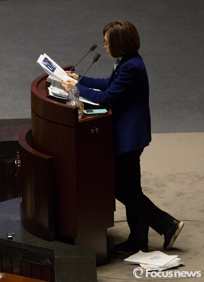 (서울=포커스뉴스) 24일 오전 서울 여의도 국회에서 은수미 더불어민주당 의원이 테러방지법과 관련해 무제한 토론을 이어가고 있다. 은 의원이 읽었던 원고가 발 아래 쌓여있다.