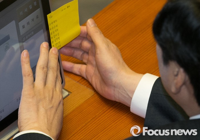 (서울=포커스뉴스) 테러방지법 직권상정에 반발해 야당의 무제한 토론(필리버스터)이 진행되고 있는 24일 오전 서울 여의도 국회 본회의장에서 원유철 새누리당 원내대표가 명단이 적힌 메모를 살펴보고 있다.