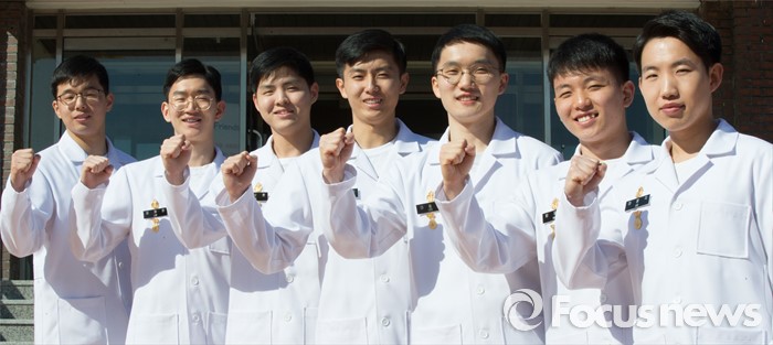 (대전=포커스뉴스) 24일 오전 대전 유성구 국군간호사관학교 백합관에서 열린 졸업매달 수여식을 마치고 제56기 남자생도들이 파이팅을 하고 있다. 56기 남자생도는 국군간호사관학교 1951년 개교 이후 61년 만에 처음으로 입소해 4년간의 교육과정을 마치고 졸업하게 됐다. 오른쪽부터 이윤각, 방윤혁, 이승주, 이우진, 이상훈, 임채원, 권재혁 생도.