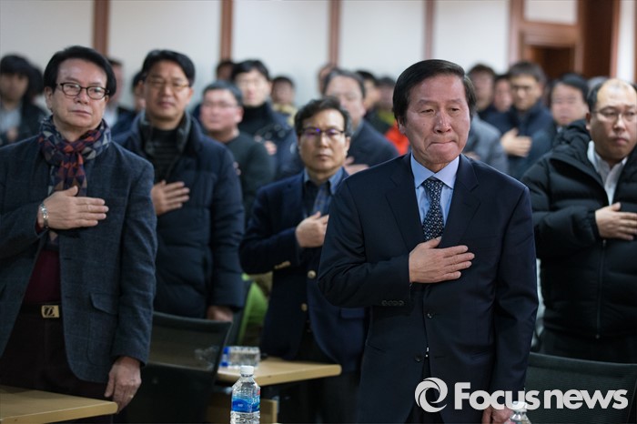 (서울=포커스뉴스) 정기섭 개성공단기업협회장이 24일 오전 서울 여의도 중소기업중앙회에서 열린 개성공단 기업 비상대책위원회 총회에 참석해 국민의례를 하며 침통한 표정을 짓고 있다.