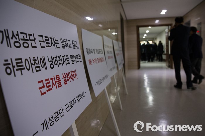 (서울=포커스뉴스) 24일 오전 서울 여의도 중소기업중앙회에서 열린 개성공단 기업 비상대책위원회 총회에서 피켓 앞으로 입주기업 관계자들이 지나가고 있다.
