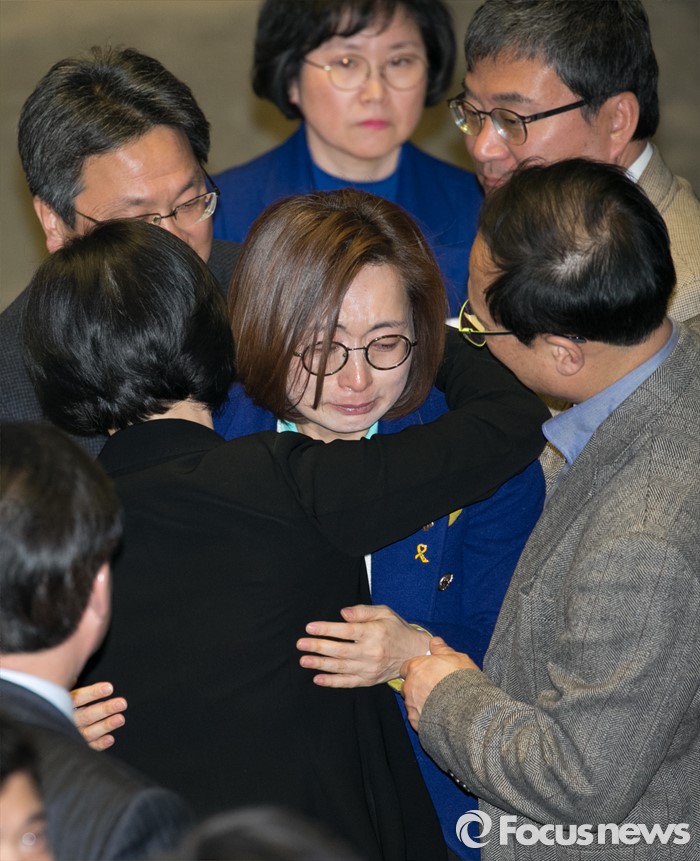 (서울=포커스뉴스) 테러방지법 직권상정에 반발해 야당의 무제한 토론(필리버스터)이 진행되고 있는 24일 오후 서울 여의도 국회 본회의장에서 토론을 마친 은수미 더불어민주당 의원이 동료 의원들의 격려를 받고 있다.