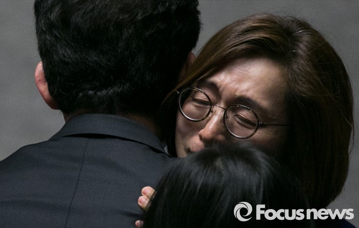 (서울=포커스뉴스) 테러방지법 직권상정에 반발해 야당의 무제한 토론(필리버스터)이 진행되고 있는 24일 오후 서울 여의도 국회 본회의장에서 토론을 마친 은수미 더불어민주당 의원이 동료 의원들의 격려를 받고 있다.