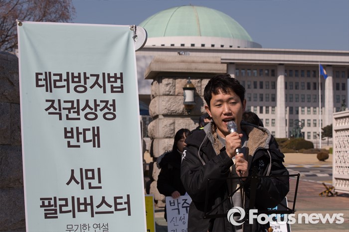 (서울=포커스뉴스) 24일 오후 서울 여의도 국회 정문 앞에서 테러방지법 처리를 반대하는 시민이 필리버스터에 참여해 연설을 하고 있다.