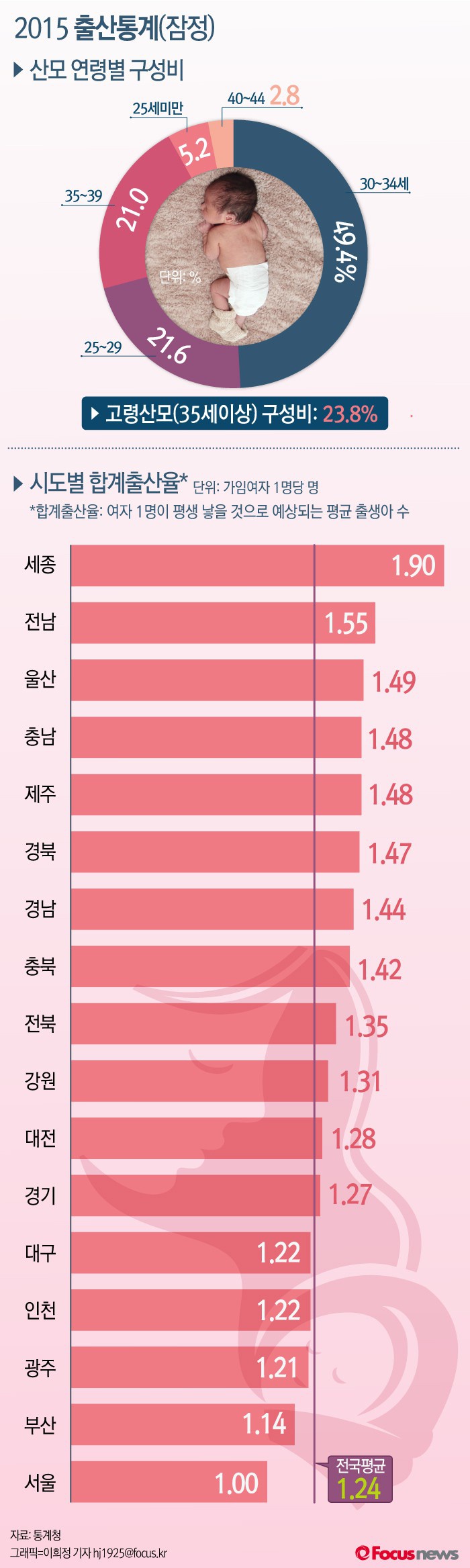 (서울=포커스뉴스) 24일 통계청이 발표한 '2015년 출생사망통계(잠정)'를 보면 합계출산율(여자 1명이 평생 낳을 것으로 예상하는 평균 출생아 수)은 1.24명이었다. 시도별로 보면 세종시가 1.9명으로 가장 높았으며 서울은 1.0명이다.산모의 연령별 구성비는 30~43세가 49.4%로 가장 많았으며 35세이상인 고령산모의 구성비는 23.8%로 전년보다 2.2%증가했다.