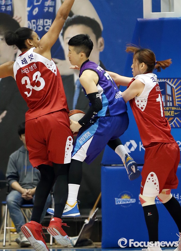 (구리=포커스뉴스) 24일 구리시체육관에서 열린 2015~2016 여자프로농구 KDB생명-삼성생명 경기에서 삼성생명 박태은이 KDB생명 플레넷과 조은주의 밀착 마크를 받으며 패스를 노리고 있다.
