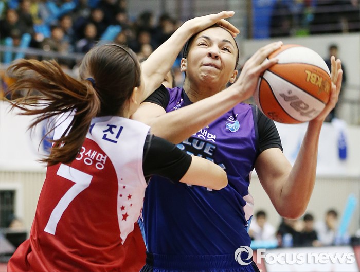 (구리=포커스뉴스) 24일 구리시체육관에서 열린 2015~2016 여자프로농구 KDB생명-삼성생명 경기에서 KDB생명 한채진이 삼성생명 스톡스를 저지하다 머리를 치고 있다.