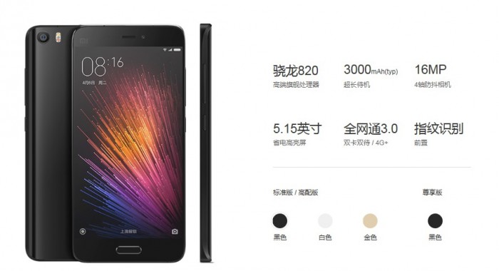 샤오미의 미5는 5.15인치 풀HD 디스플레이, 퀄컴 스냅드래곤820, 후면 1600만 화소, 전면 400만 화소 카메라, 3000mAh(밀리암페어) 배터리, 지문인식 센서 등을 탑재했다. 퀄컴의 최신 프로세서 스냅드래곤820을 탑재했다. 스냅드래곤820은 전작 스냅드래곤810 대비 성능이 200% 늘고 소비전력은 50% 줄였다. 샤오미 스마트폰 중 처음으로 지문인식 센서를 장착한 홈버튼을 탑재했다. 무게는 129g에 불과하다.