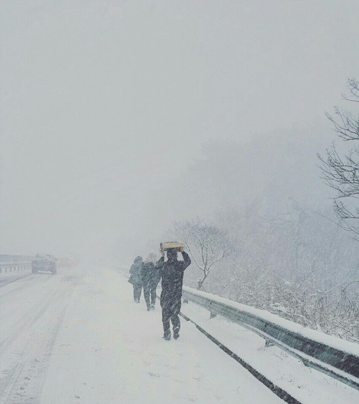 (서울=포커스뉴스) 전국이 대체로 맑겠으나 강원도 영동과 경상남북도 동해안은 동풍의 영향으로 흐리며 눈 또는 비가 올것으로 예보된 24일 경북 포항시 국립등대박물관 인근 도로에서 시민들이 국지성 폭설로 인해 차량운행이 불가능하자 걸어서 출근하고 있다. <사진제공=독자>