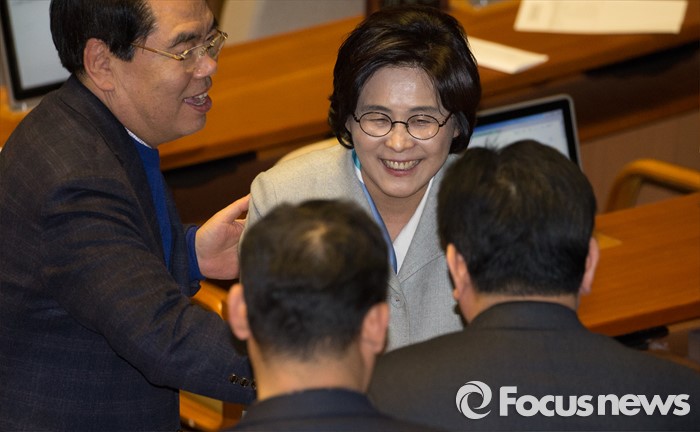 (서울=포커스뉴스) 테러방지법 직권상정에 반발해 야당의 무제한 토론(필리버스터)이 진행되고 있는 24일 오후 서울 여의도 국회 본회의장에서 발언을 마친 유승희 더불어민주당 의원이 동료 의원들과 인사를 나누고 있다.
