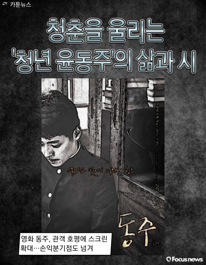 (서울=포커스뉴스) 영화 ‘동주’는 관객 호평에 힘입어 스크린 확대에 돌입했습니다. 윤동주 시집 초판본은 발간된 지 60여 년이 지난 2016년 베스트셀러가 되었습니다. 특히, 주 구매층은 20~30대인데요. 이 시대의 청춘들과 공감하는 ‘청년 윤동주’의 삶과 시에 대해 카툰뉴스로 알아보시죠.