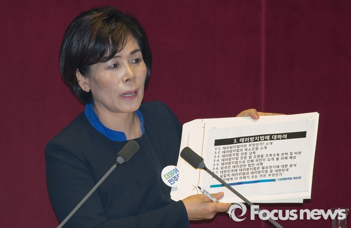 (서울=포커스뉴스) 테러방지법 직권상정에 반발해 야당의 무제한 토론(필리버스터)이 진행되고 있는 25일 새벽 서울 여의도 국회 본회의장에서 최민희 더불어민주당 의원이 발언을 하고 있다.