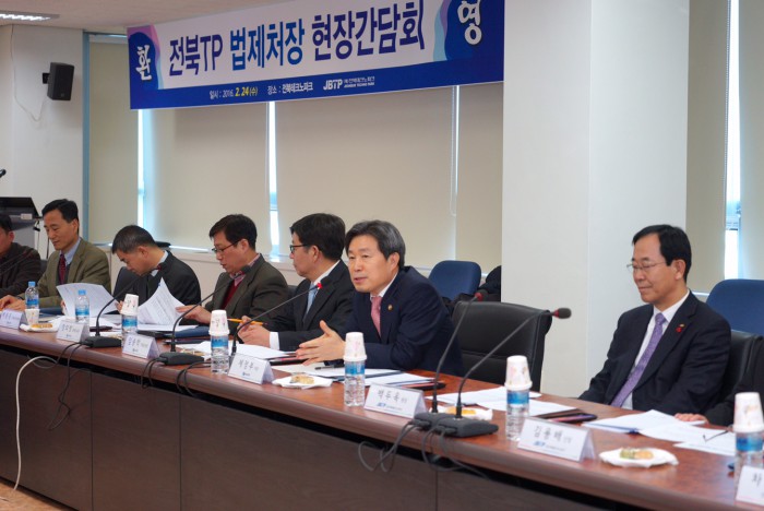 간담회에는 제정부 법제처장, 김일재 전북 행정부지사, 백두옥 전북 테크노파크 원장, 이동근 원광이엔텍 대표, 이종조 금강이앤지 대표 등 기업인들과 ECO융합섬유연구원, 전북자동차기술원, 전북생물산업진흥원 등 유관 연구기관 관계자 등 30여명이 함께했다.