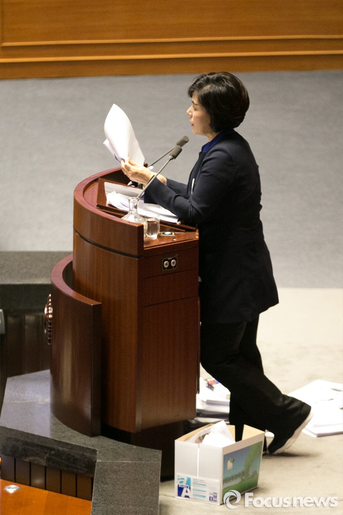 (서울=포커스뉴스) 최민희 더불어민주당 의원이 25일 오전 서울 여의도 국회 본회의장에서 테러방지법 저지를 위한 무제한 토론(필리버스터)을 하고 있다.