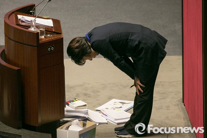 (서울=포커스뉴스) 최민희 더불어민주당 의원이 25일 오전 서울 여의도 국회 본회의장에서 테러방지법 저지를 위한 무제한 토론(필리버스터)을 마친 뒤, 허리 숙여 인사하고 있다.