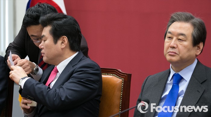 (서울=포커스뉴스) 원유철(가운데) 새누리당 원내대표가 25일 오전 서울 여의도 국회에서 열린 최고위원회의에 참석해 당직자와 대화하고 있다. 오른쪽은 김무성 대표.