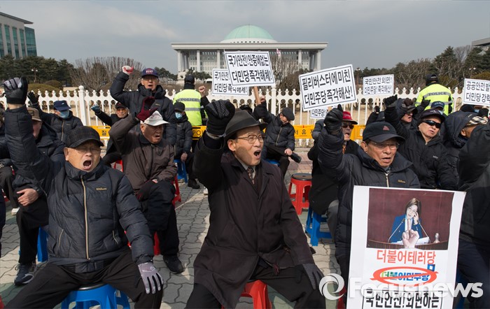 (서울=포커스뉴스) 25일 오전 서울 여의도 국회 앞에서 어버이연합을 비롯한 보수단체가 야당의 테러방지법 반대를 위한 무제한토론(필리버스터) 중단을 요구하며 기자회견을 하고 있다.