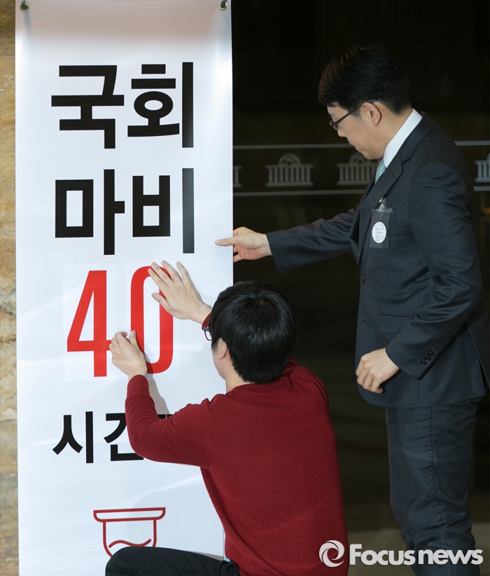 (서울=포커스뉴스) 테러방지법 직권상정에 반발해 야당의 무제한 토론(필리버스터)이 사흘째 진행되고 있는 25일 오전 서울 여의도 국회 본회의장 앞에서 무제한 토론 비판 시위에 나선 새누리당 당직자들이 피켓에 적힌 시간을 수정하고 있다.