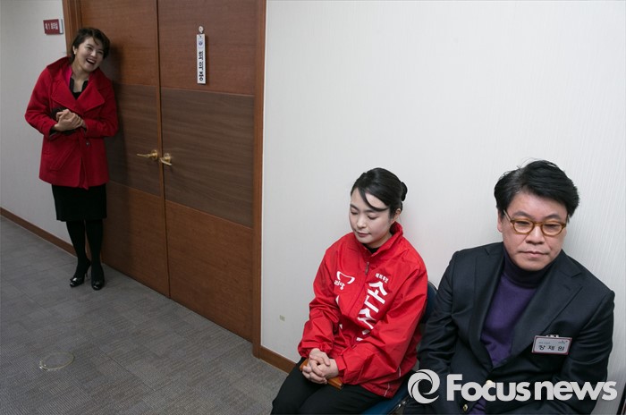 (서울=포커스뉴스) 25일 오전 서울 여의도 새누리당사에서 열린 20대 총선 공천 신청자 면접심사에 참석한 이호열 부산 사하을 예비후보의 부인 오승연(왼쪽) 전 아나운서가 남편의 면접을 기다리고 있다. 오른쪽 앉아서 면접을 기다리는 사람들은 손수조(가운데), 장제원 부산 사상구 예비후보.