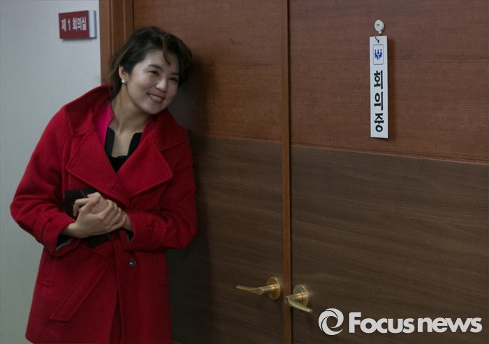 (서울=포커스뉴스) 25일 오전 서울 여의도 새누리당사에서 열린 20대 총선 공천 신청자 면접심사에 참석한 이호열 부산 사하을 예비후보의 부인 오승연 전 아나운서가 남편의 면접을 기다리고 있다.