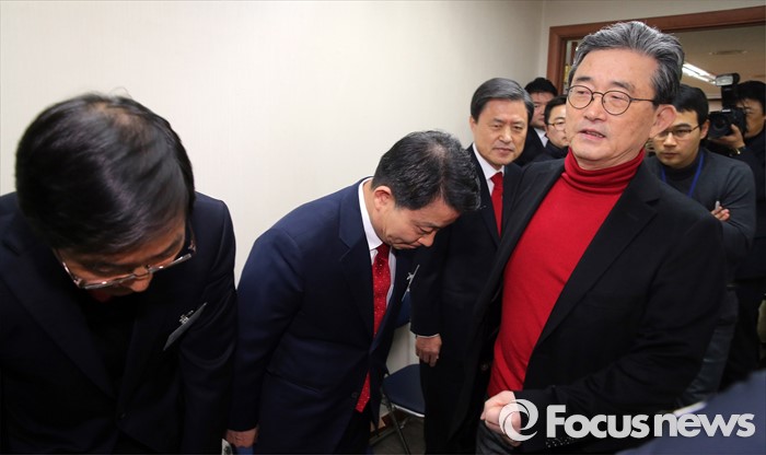 (서울=포커스뉴스) 25일 오전 서울 여의도 새누리당사에서 열린 20대 총선 공천 신청자 면접심사에 참석한 김장실(왼쪽부터), 김척수, 허남식 부산 사하갑 예비후보가 회의실로 향하는 이한구 공천관리위원장에게 인사하고 있다.