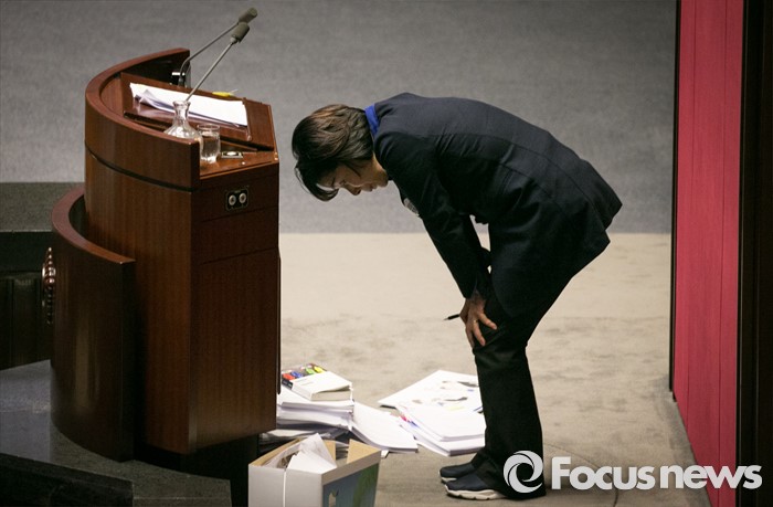 (서울=포커스뉴스) 최민희 더불어민주당 의원이 25일 오전 서울 여의도 국회 본회의장에서 테러방지법 저지를 위한 무제한 토론(필리버스터)을 마치고, 인사 뒤 허리를 숙인 채 잠시 쉬고 있다.