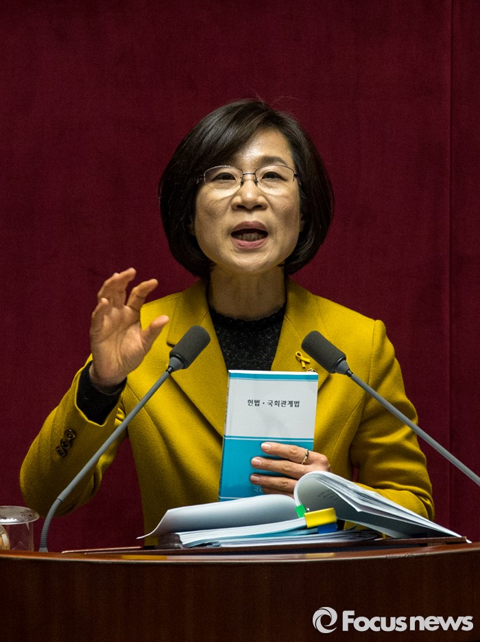 (서울=포커스뉴스) 테러방지법 직권상정에 반발해 야당의 무제한 토론(필리버스터)이 사흘째 진행되고 있는 25일 오후 서울 영등포구 국회 본회의장에서 김제남 정의당 의원이 헌법-국회관계법 책을 든 채 발언을 이어가고 있다.