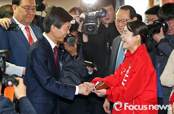 (서울=포커스뉴스) 25일 오전 서울 여의도 새누리당사에서 열린 20대 총선 공천 신청자 면접심사에 참석한 손수조(오른쪽) 부산 사상구 예비후보와 부산 사하을에 신청한 조경태 의원이 인사하고 있다.