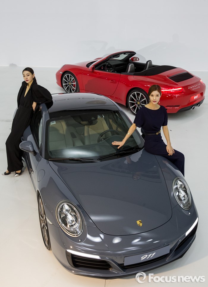 (서울=포커스뉴스) 25일 오전 서울 중구 동대문디지털플라자에서 모델들이 포르쉐 신형 911 카레라(앞)와 911 카레라S를 선보이고 있다.