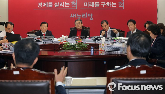 (서울=포커스뉴스) 25일 오전 서울 여의도 새누리당사에서 열린 20대 총선 공천 신청자 면접심사에 참석한 이한구 공천관리위원장 등 위원들이 부산 사하갑 예비후보들의 면접을 보고 있다.