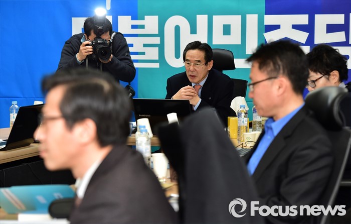 (서울=포커스뉴스) 25일 오전 서울 여의도 더불어민주당사에서 열린 20대 총선 공천 신청자 면접심사에 참석한 홍창선 공천관리위원장 등 위원들이 박영순, 고재일, 정현태 대전 대덕 예비후보에 대한 심사를 하고 있다.