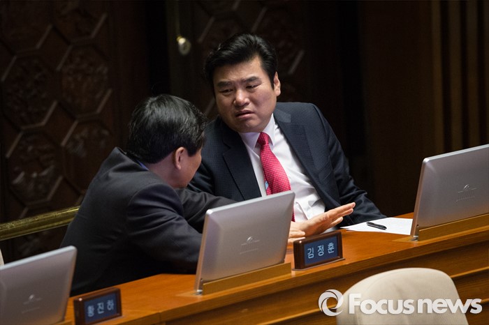 (서울=포커스뉴스) 김제남 정의당 의원이 25일 오전 서울 여의도 국회 본회의장에서 테러방지법 저지를 위한 무제한 토론(필리버스터)을 하고 있는 가운데 원유철 새누리당 원내대표와 더불어민주당 이종걸 원내대표가 대화를 나누고 있다.