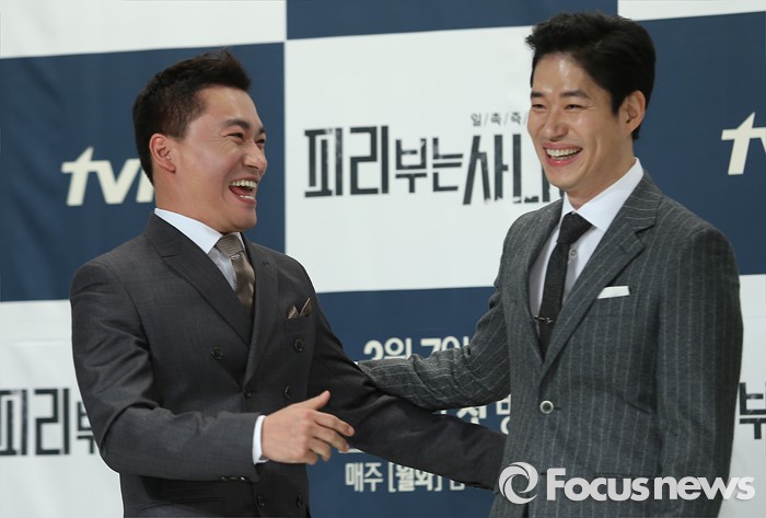 (서울=포커스뉴스) 25일 오후 서울 영등포구 타임스퀘어 아모리스홀에서 열린 tvN 월화드라마 '피리부는 사나이' 제작발표회에 참석한 배우 조재윤(왼쪽)과 유준상이 환한 미소를 짓고 있다.